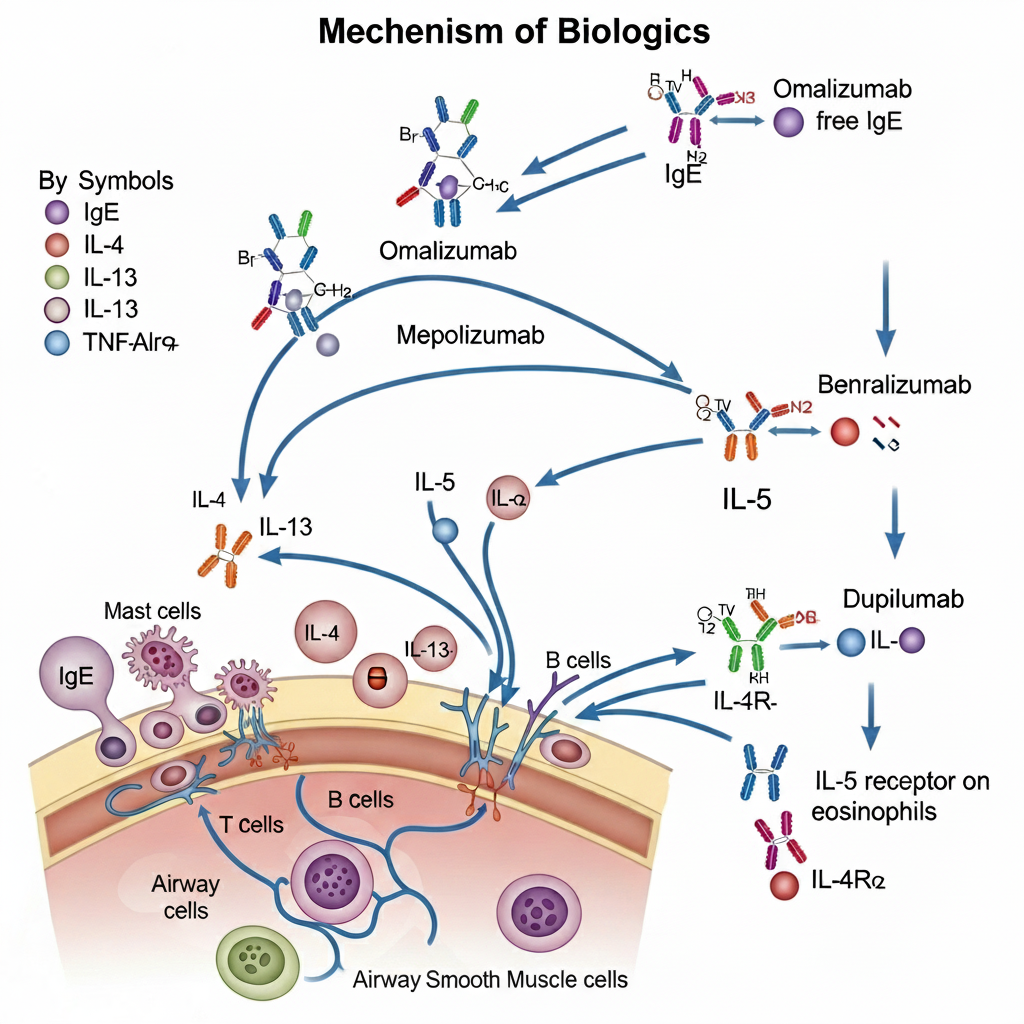 Biologic medicines are special targeted treatments. Instead of working on the whole immune system like steroids, they block specific “chemical messengers” that cause airway inflammation.