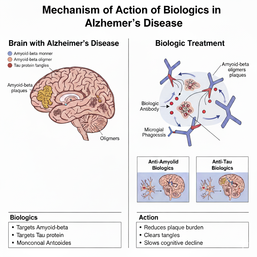Some biologics, like lecanemab and donanemab, bind to amyloid plaques and help the body’s immune system clear them away.